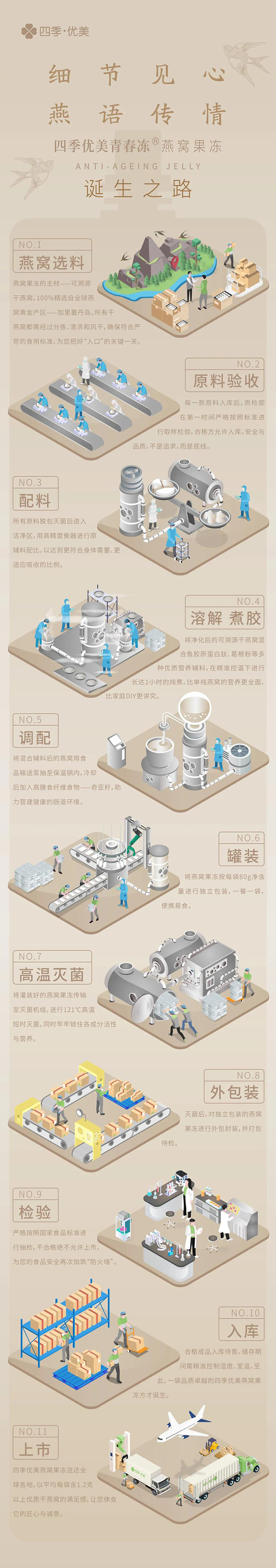 為了保證燕窩的潔凈度和品質(zhì)的穩(wěn)定性,我們的原料只從“燕屋”獲取。一個(gè)小小的“燕屋”,科技含量卻不可小視,得益于聲音模擬技術(shù)和環(huán)節(jié)模擬技術(shù)的突破,“燕屋”在光線、濕度等方面幾乎與山洞的天然環(huán)境別無(wú)二致,此外,生活于其中的燕子能得到更科學(xué)的清潔與維護(hù),同時(shí),還可以在最合適的時(shí)機(jī)采摘燕窩,從而保證營(yíng)養(yǎng)不流失、潔凈度高。除了環(huán)境高度模仿野生,燕屋模式在食物供給上也保持“原生態(tài)”:燕屋僅提供筑窩的良好環(huán)境,但不提供任何食物,燕子必須完全靠自己到燕屋之外覓食。正是得益于標(biāo)準(zhǔn)燕屋的規(guī)范化運(yùn)作,我們?cè)谂c大自然的和諧共生中獲得穩(wěn)定、優(yōu)異、可溯源的燕窩原料。